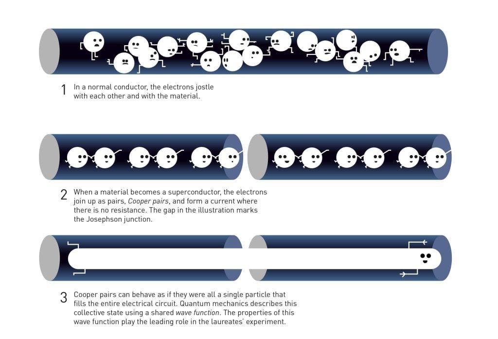 بریدن یک سیم معمولی در یک مدار الکتریکی جریان الکتریکی را قطع میکند. اما اگر سیمی با ابعاد نانومتری استفاده شود احتمال عبور الکترونها از قسمت برش خورده دیگر صفر نیست. گویی تعدادی از الکترونها میتوانند از یک تونل خیالی از فاصله بین دو نقطه جدا شده عبور کنند و یک جریان هرچند خیلی ضعیف برقرار میشود. جالب اینکه با تغییر فاصله جدایی بین این دو نقطه میتوان پهنای تونل کوانتومی و در نتیجه شدت جریان جزئی را تنظیم کرد. همین جریان بسیار ضعیف اما قابل تنظیم مبنای ساخت نوع مهمی از میکروسکوپهای روبشی است که تصویربرداری از شیوه چینش اتمها در سطح مواد را ممکن ساخته است. سه برنده جایزه نوبل امسال در یک تیم به عنوان استاد راهنما، محقق پسادکتری و دانشجوی دکتری با آزمایشهای نوآوارانه خود در دهه ۶۰ شمسی نشان دادند که مشابه با آنچه که در ابعاد نانومتری مشاهده میشود تونلزنی کوانتومی در نقطه جدایی بین دو ابررسانا (اتصال جوزفسون) در ابعاد میلیمتری هم قابل مشاهده است. بر خلاف رساناهای معمولی، در ابررساناها الکترونها در قالب جفت-الکترونهای به هم چسبیده همگی میتوانند به طور دستهجمعی در یک حالت کوانتومی یکسان قرار بگیرند طوری که عملا یک ذره کوانتومی واحد به بزرگی قطعه ابررسانا به حساب آیند. برقرای جریان بین دو ابررسانای جدا از هم به دلیل تونلزنی این ابَرذره دقیقا تحقق این پدیده کوانتومی در مقیاس قابل مشاهده با چشم است.