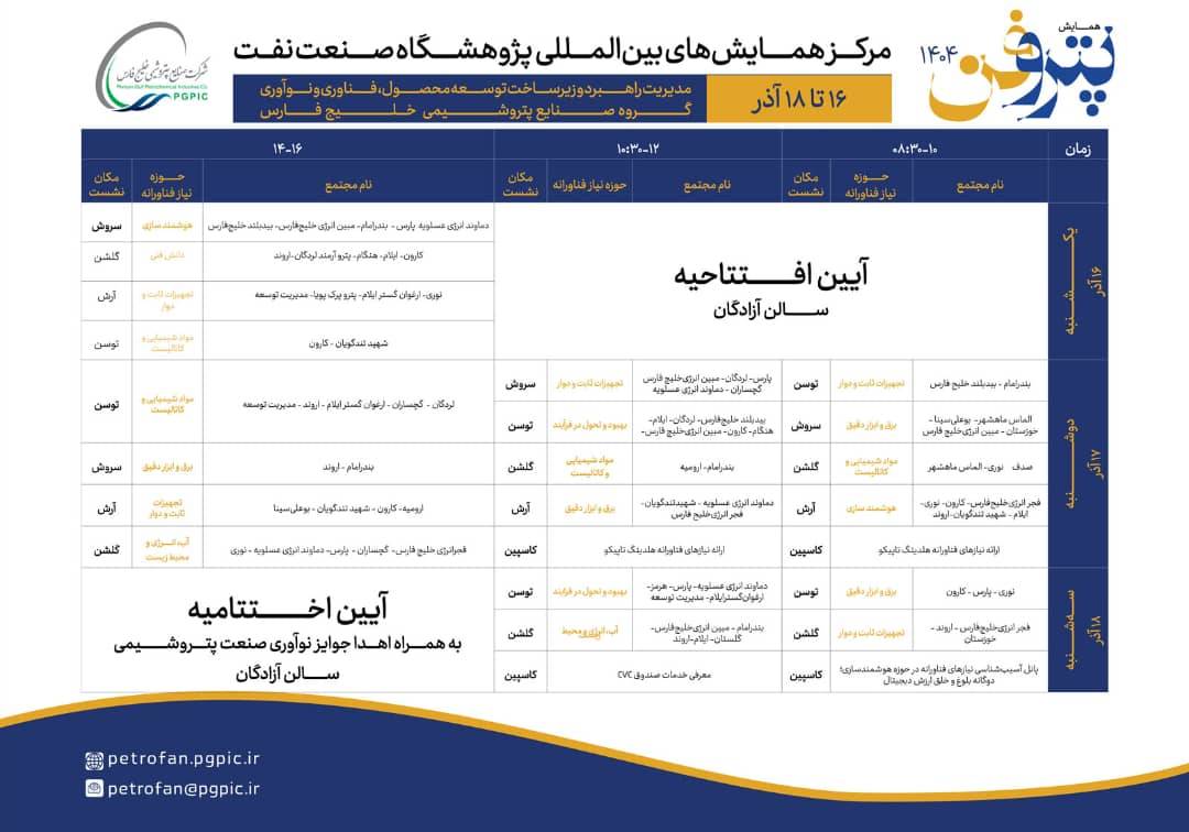 این همایش در دو بخش جایزه نوآوری صنعت پتروشیمی و رویداد تخصصی تقاضامحور (جهت رفع نیازهای فناورانه و عملیاتی شرکت‌های تابعه هلدینگ خلیج فارس) از 16 تا 18 آذر 1404 در پژوهشگاه صنعت نفت برگزار می‌شود.
